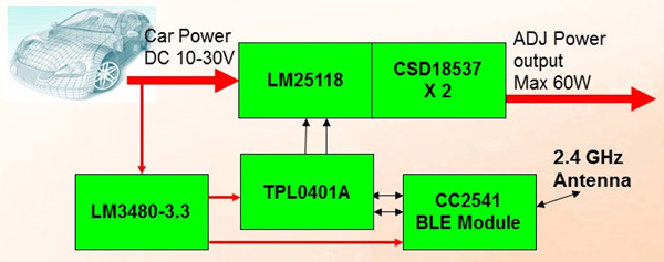 This reference design is an example of applying SimpleLink ™ Bluetooth Low Energy CC2541 wireless microcontroller to automotive DC to DC power. Its circuit can control / change the TPL0401A's unstable power supply (10 ~ 30V) through the high-power buck-boost integrated circuit LM25118 and CSD18537N with the output voltage level set / adjusted by the Bluetooth low energy module. The equivalent resistance value is used to control the final output voltage of the LM25118 according to the output voltage level set / adjusted by the user through the APP to provide the stable output of the power set / adjusted by the user. For example: CC2541 accepts the user to issue 19V voltage through the mobile APP, and changes the resistance of TPL0401A to allow the LM25118 to provide a stable 19V output, which can directly charge the notebook computer.